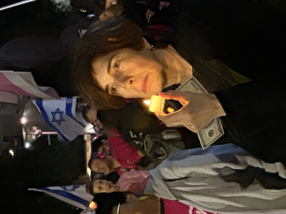 A woman with brown hair holds a lit candle and a one hundred dollar bill in her hand. Behind her, people gather with flags of Israel. The overall lighting suggests an evening vigil or protest. The presence of the currency might be a symbol of something, but it is hard to tell what it means.