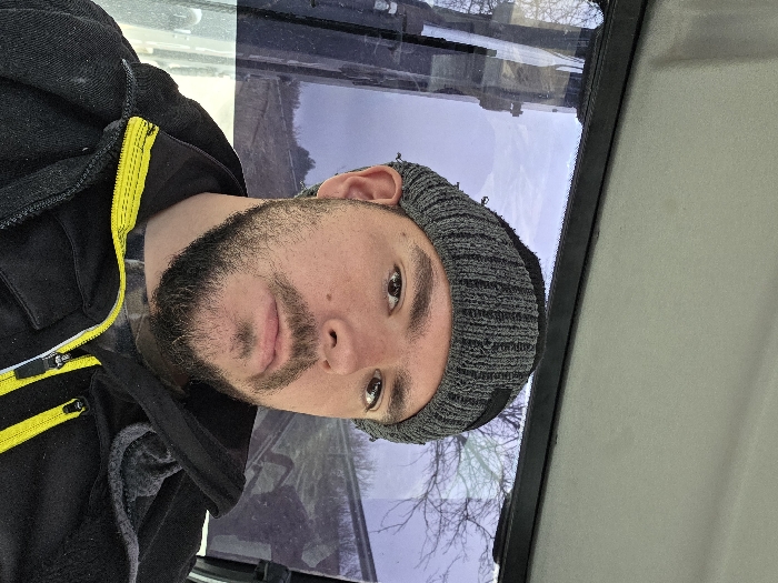 A male individual with a beard and mustache is depicted in a close-up, head-and-shoulders portrait, looking directly at the camera with a neutral expression. He is wearing a grey knitted beanie cap and a black jacket featuring prominent yellow zippers and accents over a patterned shirt. The individual is positioned within the cab of a vehicle, indicated by a light-colored ceiling and dark window frames. Through the vehicle's windows, a wintry or early spring outdoor environment is visible, characterized by bare tree branches, an overcast sky, and distant undulating terrain. The scene is located in the city of Yablanitsa, Bulgaria.