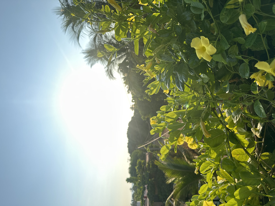 Bright yellow flowers bloom amidst lush green foliage, bathed in strong sunlight. Tall trees and a hazy blue sky create a tropical backdrop. The scene is captured from a low angle, looking upwards towards the sun. The image is slightly rotated, giving it a tilted perspective. The combination of vibrant flora, intense sunlight, and vivid colors creates a lively and serene atmosphere.