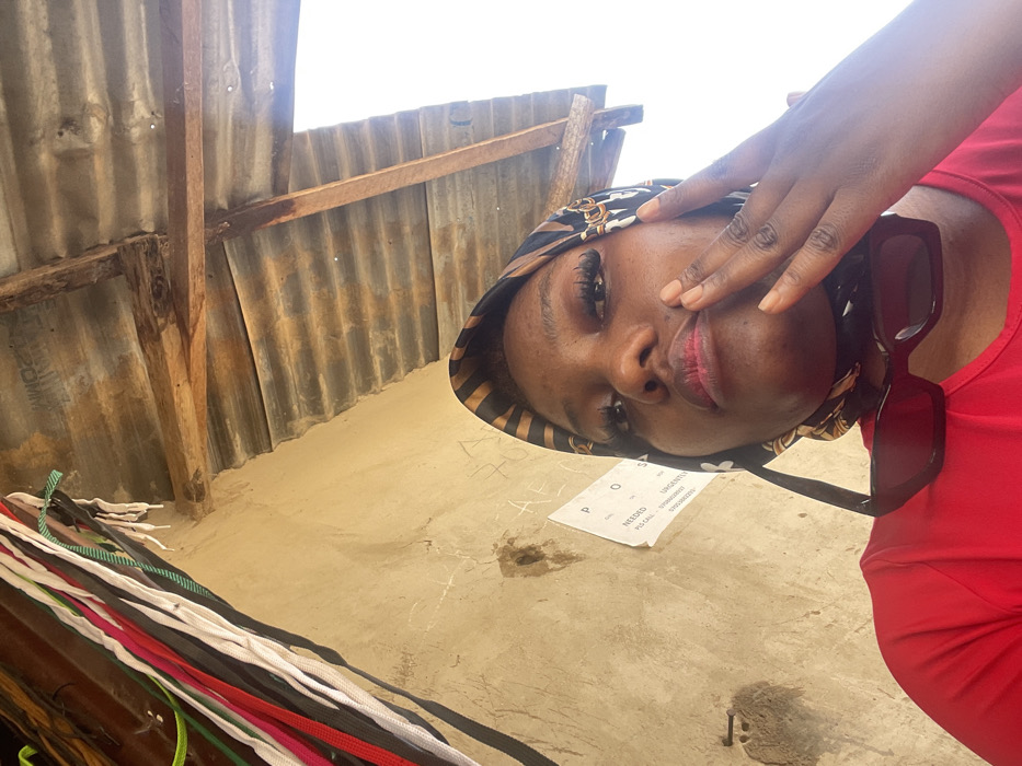 A young woman is depicted in a close-up, upward-angled shot within an open-air or partially sheltered structure in Dzhidu, Nigeria