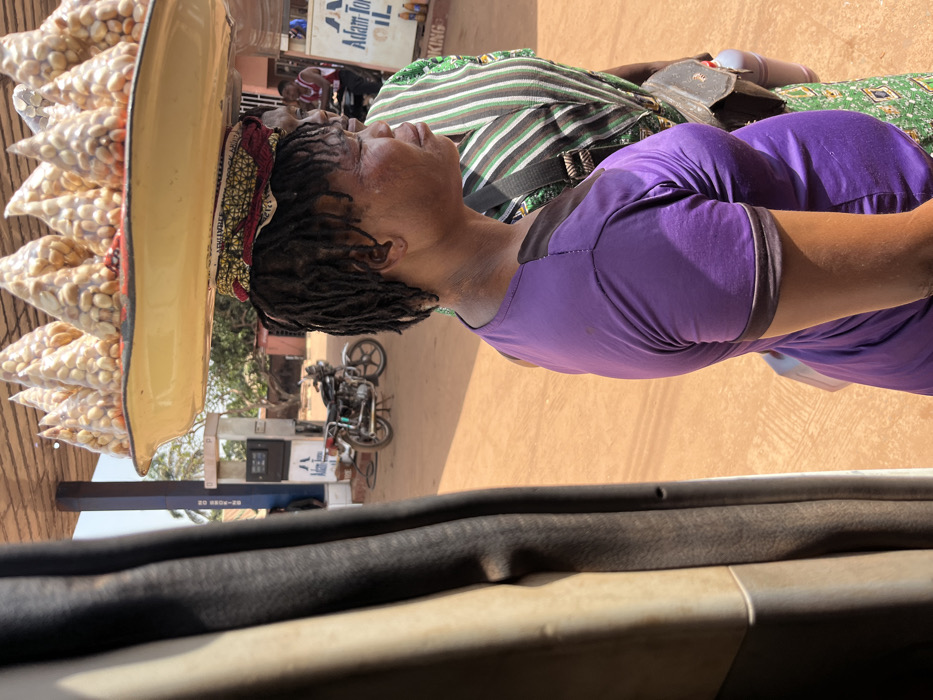 The scene depicts an outdoor street or marketplace environment in Otukpa, Nigeria. The foreground is dominated by a dark-skinned woman with dreadlocks, positioned in profile facing right. She is balancing a large, flat, yellow tray on her head, which holds approximately a dozen conical, clear plastic bags filled with light-colored nuts, likely groundnuts. A patterned headwrap is visible beneath the tray. She wears a purple short-sleeved top with dark trim and exhibits a closed-eye or squinting expression, with a noticeable mark on her right cheekbone. Behind the primary subject, a second dark-skinned woman is partially visible, wearing a green, white, and black striped top and a patterned lower garment, with a dark bag slung over her shoulder. Further back and to the right, a third individual, a man in a red and white striped shirt, is faintly visible near a blue and white structure. The background features reddish-brown dirt ground. To the left of center, a blue and white fuel station is discernible, including a fuel pump. A silver and black motorcycle is parked on a kickstand on the dirt. A sign bearing "Adam Tom OIL" and several yellow jerry cans are visible to the far right. Distant trees and sparse vegetation complete the background. The image is captured from inside a vehicle, with a dark, vertical vehicle door frame or pillar partially obscuring the left side of the frame. The scene is brightly lit by natural sunlight.