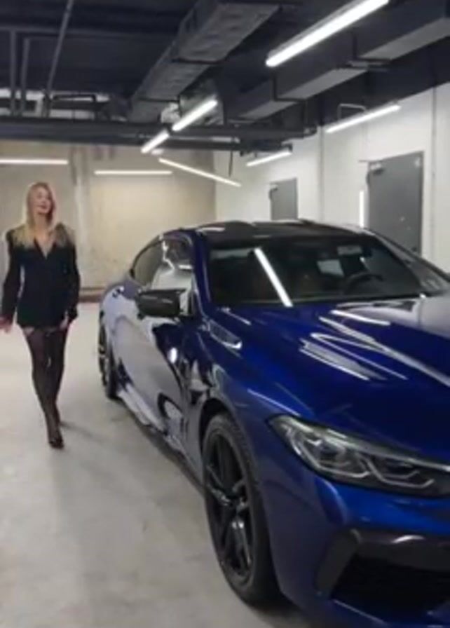 A blonde woman is standing next to a blue BMW in a parking garage. She is wearing a black blazer, black hosiery, and black heels. She is standing and gesturing with her hands. The car is shiny and has black rims. The parking garage has a black ceiling with fluorescent lights. There is a door in the background.