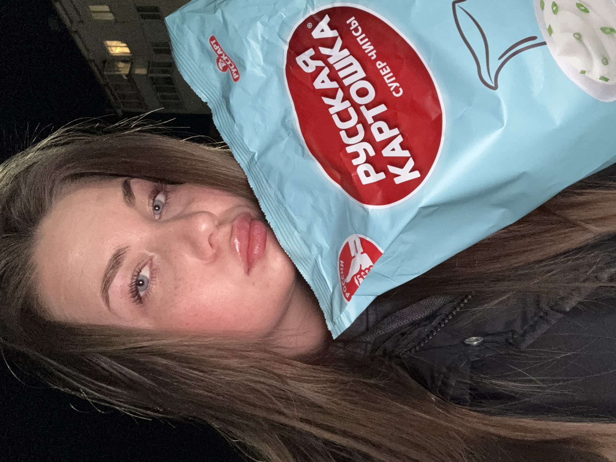 A selfie shows a young woman with long, light brown hair and blue eyes. She has fair skin with freckles and is making a kissing face towards the camera. Part of her face is obscured by a light blue bag of "Russian Potato" chips, with Cyrillic text and images of green onions and sour cream. She is wearing a black jacket. The background shows a building illuminated by lights, suggesting an urban environment at night. The location is Chaikovsky, Russia, based on the Cyrillic text on the chip bag.