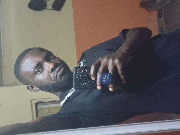 A selfie of a bearded man with dark skin. He is wearing a black shirt with a white collar visible. The man holds a phone with a sparkling case and a blue bottle cap attached to the back. The background includes a light yellow and orange wall, a picture frame, and a ceiling fan. The image appears to be a mirror reflection.