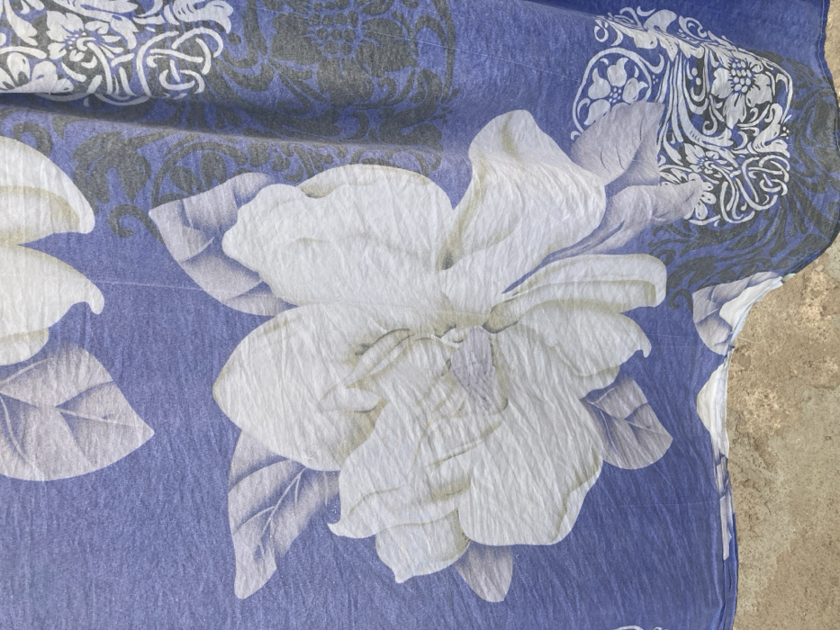 - "The image displays a close-up, vertical view of a fabric textile, likely a bedsheet or clothing item, patterned with large off-white floral motifs and accompanying grey leaves against a periwinkle blue background" by FM-HxB5A3, licensed under CC BY 4.0