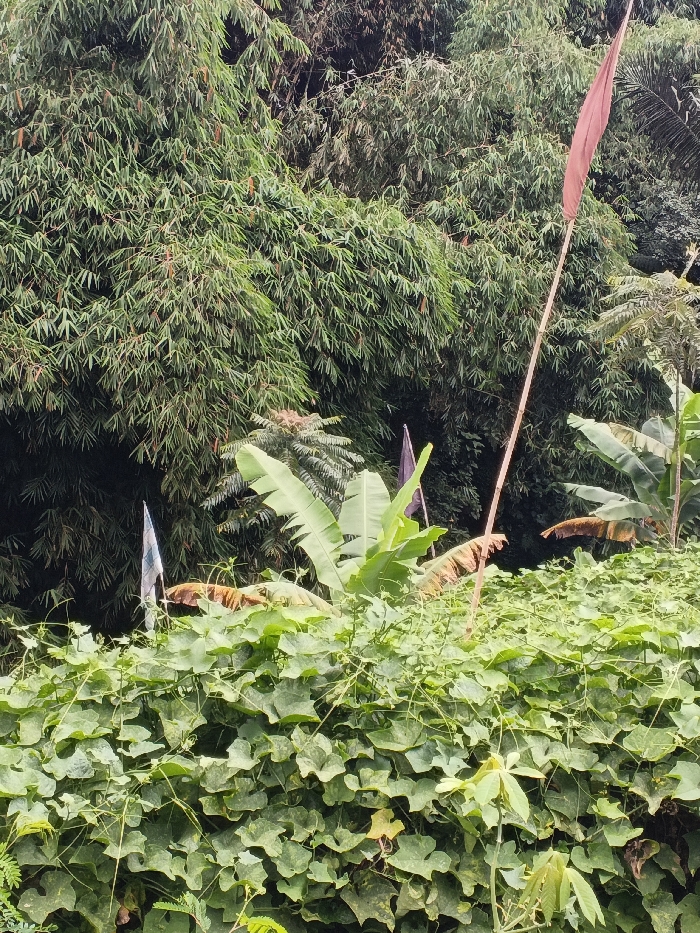 A lush, green scene dominated by dense foliage. Bamboo trees form a backdrop, partially obscuring the view. In the midground, banana leaves are interspersed with other plants. A thick layer of sprawling green vines covers the foreground. Several flags on tall poles are visible, one with a reddish-brown color and others with lighter colors. The overall impression is one of a vibrant, overgrown tropical landscape.