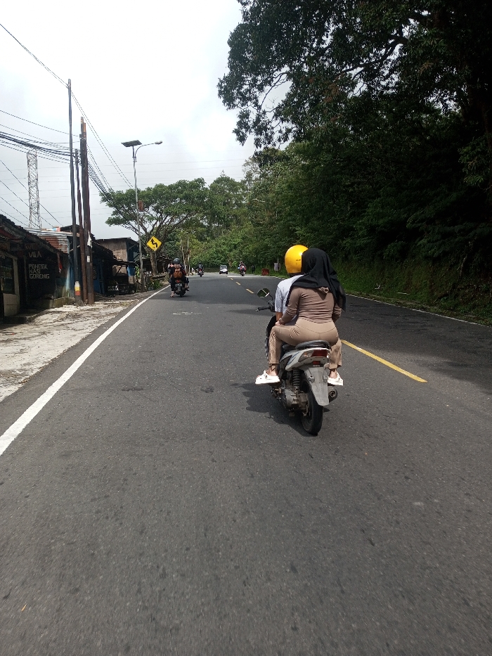 The image depicts a daytime scene on a paved two-lane road in Saing Ta Mawt Lay, Myanmar, under an overcast sky. In the foreground, a light-colored scooter travels away from the viewer, occupied by two individuals. The driver wears a light-colored long-sleeved shirt and a yellow helmet. The passenger, seated behind, wears a black hijab, a light brown long-sleeved top, matching light brown pants, and white sneakers. The asphalt road features a solid white line marking the left shoulder and a partial double yellow line indicating a no-passing zone or opposing traffic in the center. On the left side of the road, a dirt shoulder abuts several utility poles carrying multiple wires. Beyond these poles are rudimentary, weathered structures, some with corrugated metal roofs. One visible sign on a dark building reads "VILA" and "Pondok Nasi Goreng." A street light with a solar panel is mounted on one pole, and a yellow diamond-shaped warning sign depicting a winding road is also present. In the far left background, a large metal lattice tower is visible above the structures and trees. Further down the road, additional motorcycles and a light-colored car are observed traveling in the same direction. The right side of the road is bordered by a dense, dark green wall of trees and foliage, indicative of a natural slope or hill. The sky is uniformly light grey and overcast.