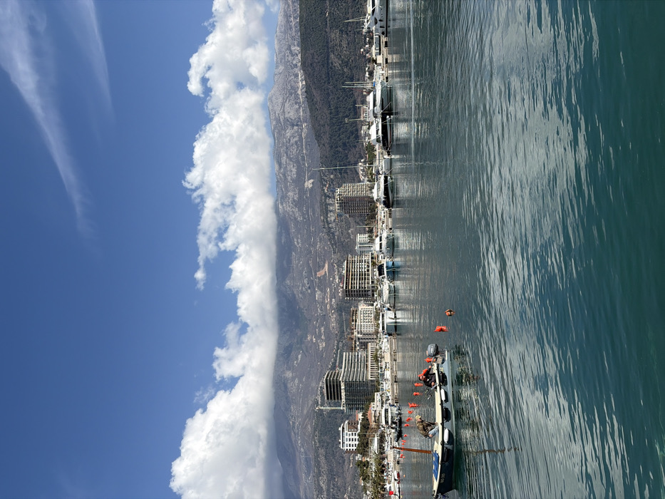 - "The image depicts the marina and coastline of Budva, Montenegro, under a clear blue sky with white cumulus clouds clustered above a large, rocky mountain range in the background" by FM-jVOLQ2, licensed under CC BY 4.0