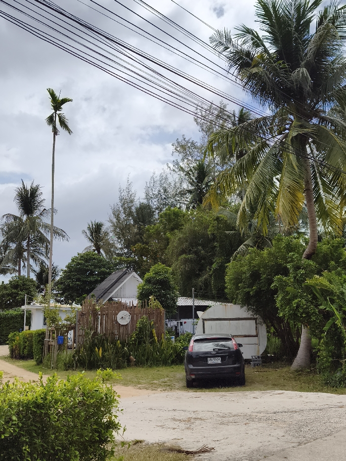 A black car parks on a dirt road next to a small, white, food vendor cart. Lush, green trees and foliage surround the area, including tall palm trees. A small, white building with a black roof can be seen behind a wooden fence. Overhead, power lines stretch across a cloudy sky. A tall, slender palm tree stands out among the varied greenery. The scene appears to be set in a tropical or semi-tropical location.