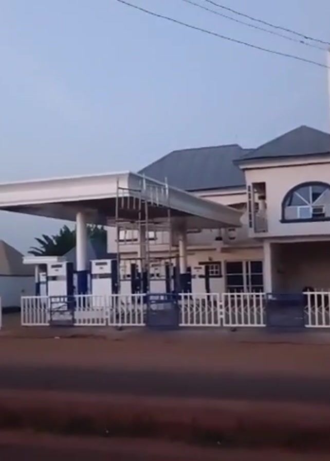 The scene depicts a petrol station with a two-story building attached to it, taken at dusk or dawn