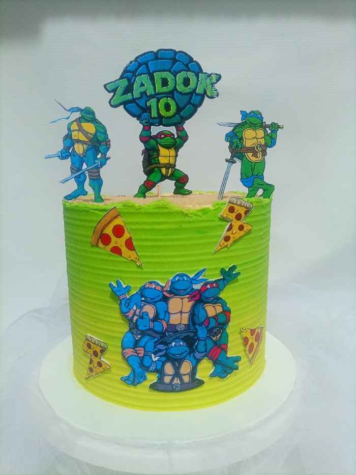 A single-tier, cylindrical birthday cake, approximately 25cm in height, stands centered on a white circular cake board atop a fluted white cake stand. The cake is uniformly iced in a vibrant lime green frosting with horizontal ribbed texturing, transitioning to a slightly lighter green-yellow near the base. The top surface of the cake is textured in a light brown, resembling sand or earth. Cake toppers are strategically placed on the top surface. Centrally, a Teenage Mutant Ninja Turtle character, identified by its green body and red mask (Raphael), is depicted holding a large, blue and green circular sign above its head. The sign spells "ZADOR" in blue letters across the top, with the number "10" in green below, all stylized within a shell-like texture. To the left of the central figure, another green-bodied turtle character, wearing a blue mask (Leonardo), stands holding two katanas. To the right, a third green-bodied turtle character, also wearing a blue mask (Michelangelo), holds two short, slender sticks (nunchaku). The side of the cake is adorned with additional decorations. Towards the bottom front, an edible image depicts a group of the four Teenage Mutant Ninja Turtles (Leonardo, Donatello, Michelangelo, Raphael) huddled together, each distinguishable by their traditional mask colors (blue, purple, orange, red, respectively) within the larger blue-toned image. Scattered around the side of the cake are multiple cutouts resembling pizza slices, some featuring a lightning bolt design, all displaying red pepperoni on a yellow cheese base. The background is a plain, light-colored surface, likely a wall or backdrop, indicating an indoor setting. A sheer, white fabric is visible draped around the base of the cake stand. No people are visible. The specific location within the city of Jos, Nigeria, cannot be determined from the visual information presented in the image.