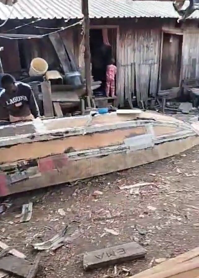 The video showcases a small outdoor carpentry workshop possibly in a coastal or waterfront setting. Initially, a young boy is seen walking, and an adult works in the background near planks of wood. The camera then pans to reveal more of the workshop, with benches, a saw, and stacks of lumber. Later shots show a collection of wooden boats, some appearing to be under construction or repair, and a view of a slum settlement built on the water. The settlement is characterized by small wooden structures and a cluttered environment. In the final shots, the camera focuses on the wooden boats in the water and a rundown wooden shack. The overall impression is one of a working community living in a modest waterfront area.