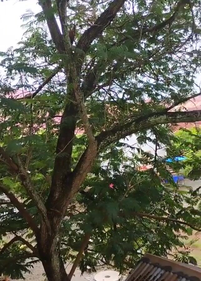 tree with green leaves and bare branches, partially obscuring a view of buildings with red and green roofs. The camera pans upwards, revealing more of the tree and sky. The foreground includes a rusty corrugated metal roof.