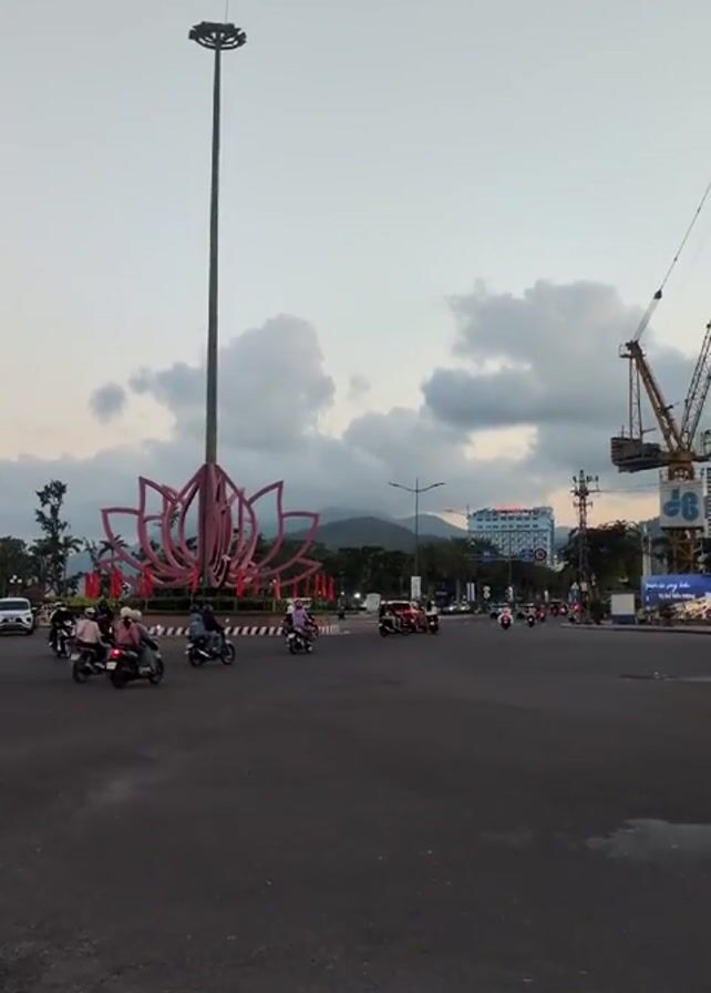 busy intersection in Vietnam. Numerous motorbikes are driving through the intersection, circling a large lotus flower sculpture in the middle. A tall streetlight stands next to the sculpture. In the background, there is a mountain range under a cloudy sky, a construction crane, and buildings. The video is shot from a low angle, capturing the traffic flow and the scale of the lotus sculpture and the surrounding environment. The overall impression is of a typical urban scene in Vietnam at dusk.