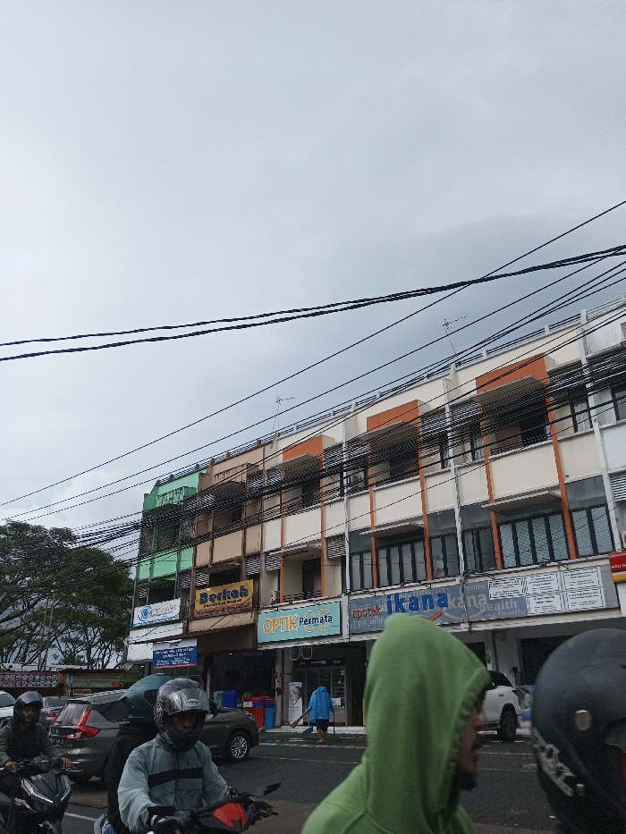 The image depicts a street scene in Ambakirano, Madagascar, on an overcast day. The upper half of the frame is dominated by a light grey, cloudy sky crisscrossed by multiple black electrical or communication wires. Below the wires, a row of three to four-story commercial buildings with varying facades – including beige, orange accents, grey, and green – lines the street. Shop signs written in what appears to be Indonesian script are visible on the ground level, including "Berkah," "Optik Permata," and "Apotek Ikana Health." In the foreground, slightly right of center, the partial view of a person wearing a green hooded sweatshirt (hood up) is visible, facing right. To their left, a person in a grey long-sleeved shirt and a black full-face helmet operates a red and black scooter/motorcycle, positioned centrally in the road. Further left, another person in a dark green long-sleeved shirt and a black full-face helmet rides a black scooter/motorcycle. A grey SUV is visible behind the left-most scooter, and a white sedan is partially visible near the right sidewalk. On the sidewalk, in front of the "Optik Permata" shop, a person clad in a blue hooded poncho is observed holding a broom-like object, engaged in sweeping. Large green trees are visible on the far left, behind the street level. The street pavement appears wet in certain areas.