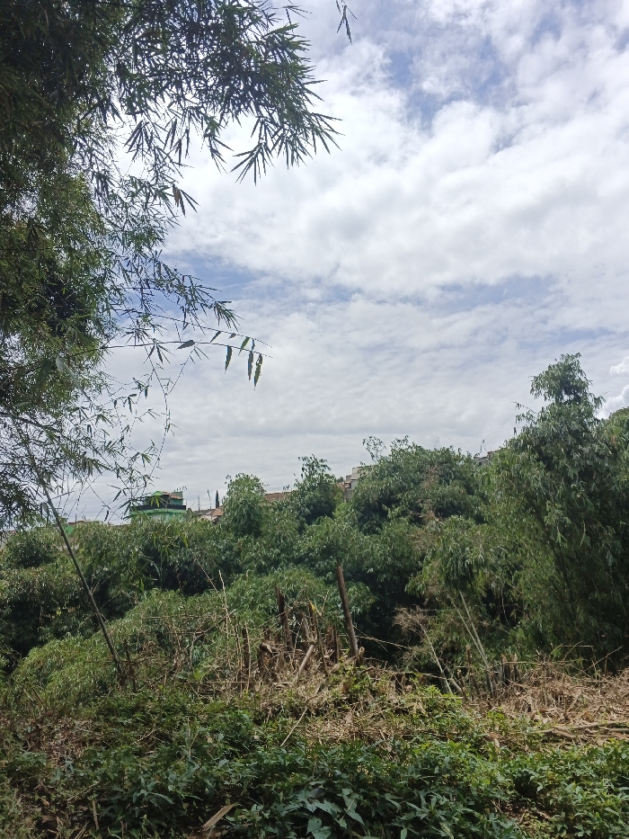 Lush, green vegetation dominates the scene, a mix of bamboo and leafy plants filling the frame. A dense thicket of undergrowth carpets the ground, interspersed with fallen branches and debris. In the distance, glimpses of buildings emerge beyond the treeline. The sky is overcast with scattered clouds, casting soft light on the landscape. Branches of bamboo arch overhead, framing the view.