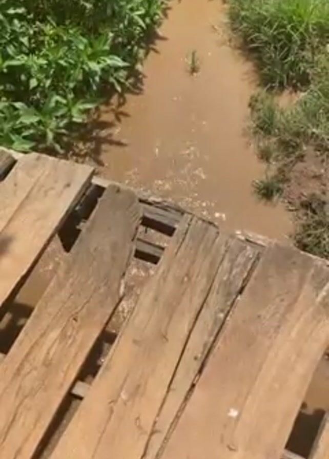 The scene shows a dilapidated wooden bridge spanning a small, muddy stream. The bridge is made of weathered planks, with several gaps and missing sections that reveal the water below. The stream is shallow and murky, with a brown tint, flowing at a gentle pace. Lush green vegetation surrounds the bridge, with plants on either side extending to the edge of the water. The camera is positioned on the bridge, looking down at the stream, capturing the broken surface of the wood and the water flowing underneath. The lighting suggests a sunny day, with shadows partially visible.