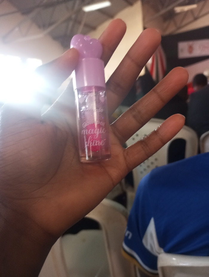 A dark-skinned left hand holds a clear, cylindrical bottle approximately 8-10 cm tall. The bottle contains a pink liquid with suspended glitter particles and is labeled "Glow-up oil magic shine." It is topped with a light pink, heart-shaped cap. The hand grips the bottle between the thumb and index finger, with the remaining fingers extended. The background indicates an indoor setting, likely a large hall or event space, with visible metal truss ceiling structures. Rows of white plastic chairs are present, occupied by blurred human figures. One individual in the lower right foreground wears a blue and yellow garment. A dark banner with white text is partially visible further in the background. A prominent lens flare from a bright light source is present in the upper left of the image. This scene is located in Eldoret, Kenya.