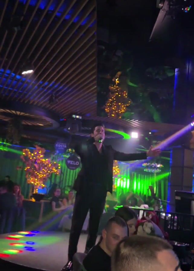 Here’s a detailed description of the video: The video depicts a man performing on a small stage in what appears to be a nightclub or lounge. The man is wearing a dark suit and is holding a microphone, singing with his arms outstretched. The stage is illuminated with multi-colored lights, including spotlights that create beams through the air. The background features a modern interior design with wooden slatted ceiling elements and a mirrored section reflecting decorative trees adorned with lights. There are visible logos for "Costa Coffee" and "VELO" on the decor. Several people are seated at tables in the foreground and background, watching the performance. The video is shot from a slightly low angle, with the camera moving slightly, focusing mainly on the performer.