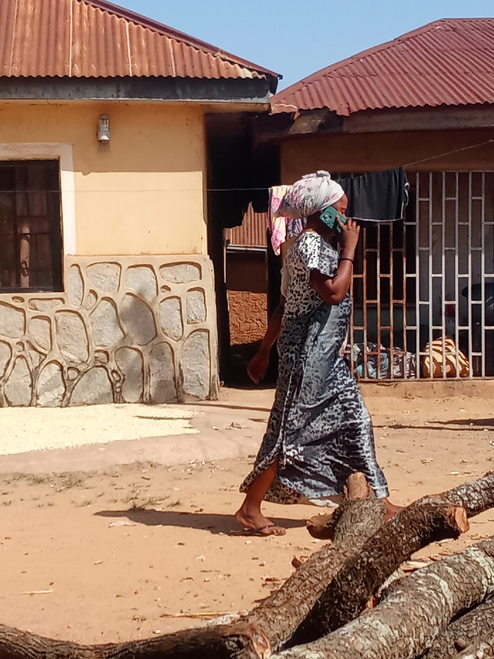 The scene is set in Akwanga, Nigeria, under a clear blue sky and bright daylight. A female individual walks barefoot from left to right across a reddish-brown dirt path. She wears a patterned long-sleeved dress or gown with an animal print pattern in black, white, and grey, and a light-colored, possibly floral, head wrap. Her right hand holds a green-cased smartphone to her right ear, indicating she is engaged in a phone call. In the immediate foreground, a pile of cut tree logs with visible bark texture lies horizontally across the lower portion of the frame. To the left of the walking individual, a section of lighter, possibly paved ground or concrete, is visible, covered with a thin, scattered layer of small, light-colored grains or seeds, seemingly left to dry. In the background, two single-story residential buildings are prominent. The structure on the left features light yellow-tan walls with a lower decorative section composed of grey, irregularly shaped stonework. It has a dark-framed window and a white, cylindrical wall-mounted light fixture. Its roof is made of rusted, reddish-brown corrugated metal. The building on the right has darker, possibly ochre-colored, walls and a similar rusted corrugated metal roof. A white metal security gate or window bars are visible on its facade. Between the two buildings, a clothesline is strung, from which several items of laundry, including dark and light-colored fabrics, hang to dry.