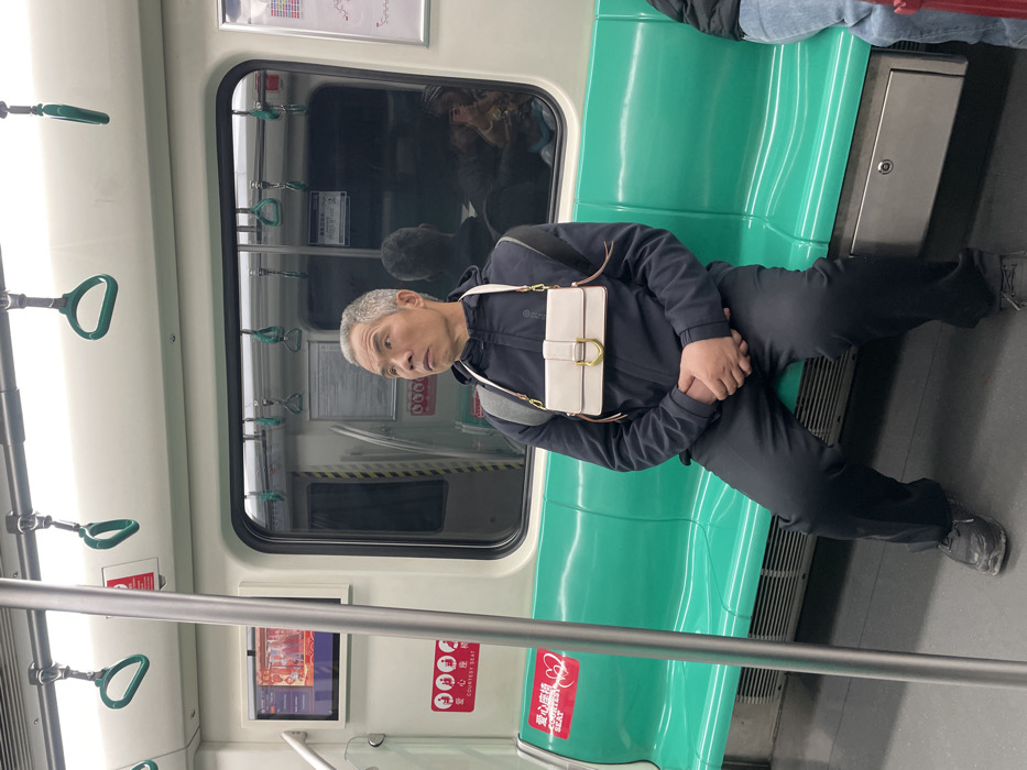 An East Asian male, appearing middle-aged with graying hair, is seated on a green bench seat inside a subway train car in Changping District, China