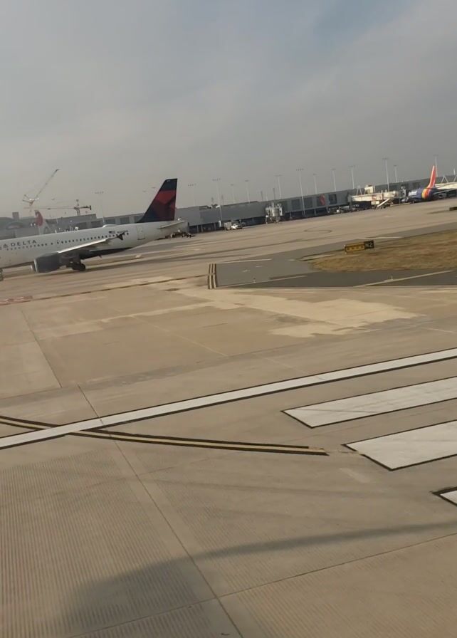 The video depicts an aerial view of an airport runway and terminal area. A Delta Airlines plane is visible parked at a gate. Other planes from various airlines are also parked at adjacent gates. The runway markings are clearly visible. The sky is overcast with light clouds. The scene appears to be taken from an airplane window.