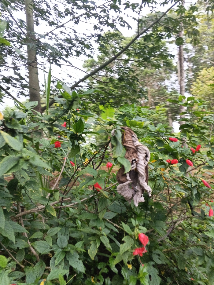 The image depicts an outdoor natural environment, stated by the user to be in Moe Gyoe, Myanmar. The foreground is dominated by dense green foliage, primarily comprised of leafy shrubs and branches. Numerous small, bright red, tubular flowers are visible among the green leaves, along with a few sparse yellow flowers. A crumpled piece of light brown or tan fabric, possibly a rag or garment, is caught or draped on a branch amidst the foliage, slightly right of the image center. The background is out of focus, revealing tall tree trunks and canopies against a bright, overcast sky, suggesting a lush, vegetated area. No individuals or specific actions are observable within the frame.