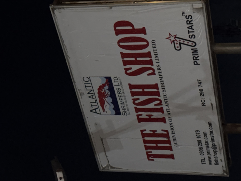 A rectangular commercial sign is depicted, photographed front-on at night, located in Babban Giji, Nigeria. The sign features a white background with visible wear, including peeling and minor damage along its edges. The upper section displays "ATLANTIC" in black text, positioned above a logo consisting of a red shrimp on blue waves. Below the logo, "SHRIMPERS LTD." is printed in black, followed by "ISO 9001:2015 REGISTERED COMPANY" in smaller font. The central and most prominent text reads "THE FISH SHOP" in large, bold red capital letters. Below this, in smaller black text, is "(A DIVISION OF ATLANTIC SHRIMPERS LIMITED)". The lower left quadrant of the sign lists contact information: "TEL: 0906 298 1079", "www.primstar.com", and "fishshop@primstar.com". Centered beneath the main text is "RC: 290 747". The lower right quadrant features a logo for "PRIM 7 STARS™", comprising the word "PRIM", a stylized "7" with an integrated star, and "STARS™". The sign is supported by an indistinct structure, partially visible at the bottom. The background is uniformly dark, suggesting nighttime conditions. No individuals or active interactions are present in the image.