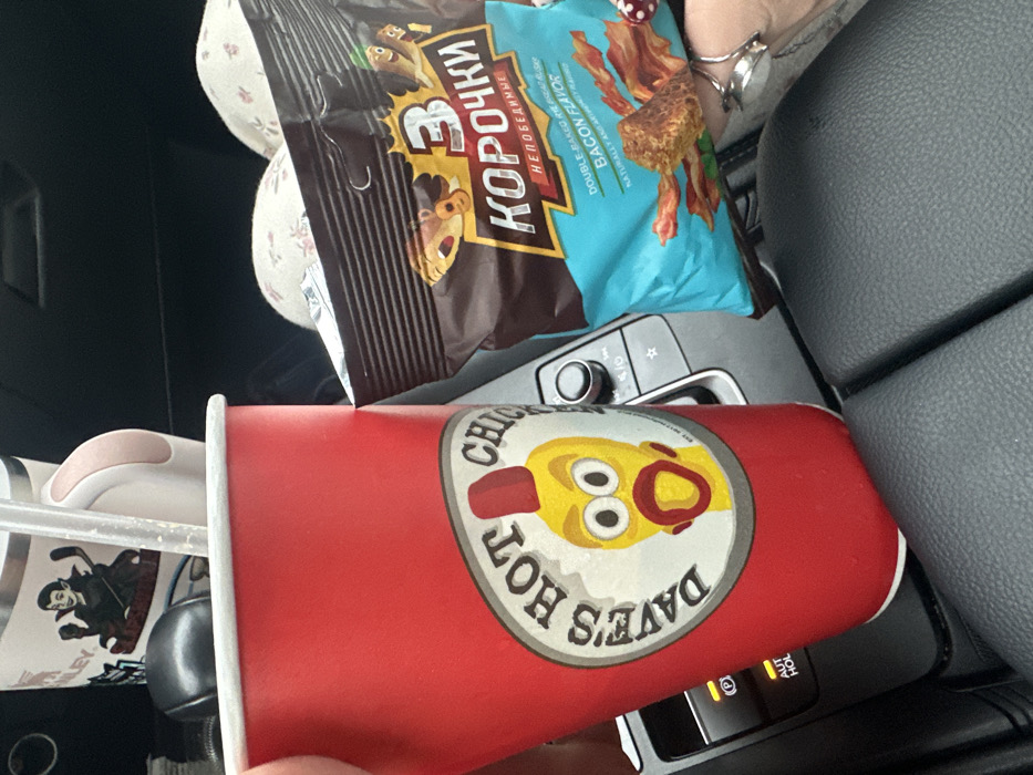 cup of Dave's Hot Chicken, with its distinctive cartoon chicken logo, placed next to a bag of "3 Korochki" bacon-flavored chips. A cup with a vampire sticker on it sits on the side. The items appear to be inside a car, possibly placed on or near the console, with visible car interior components such as the gear selector and seat.