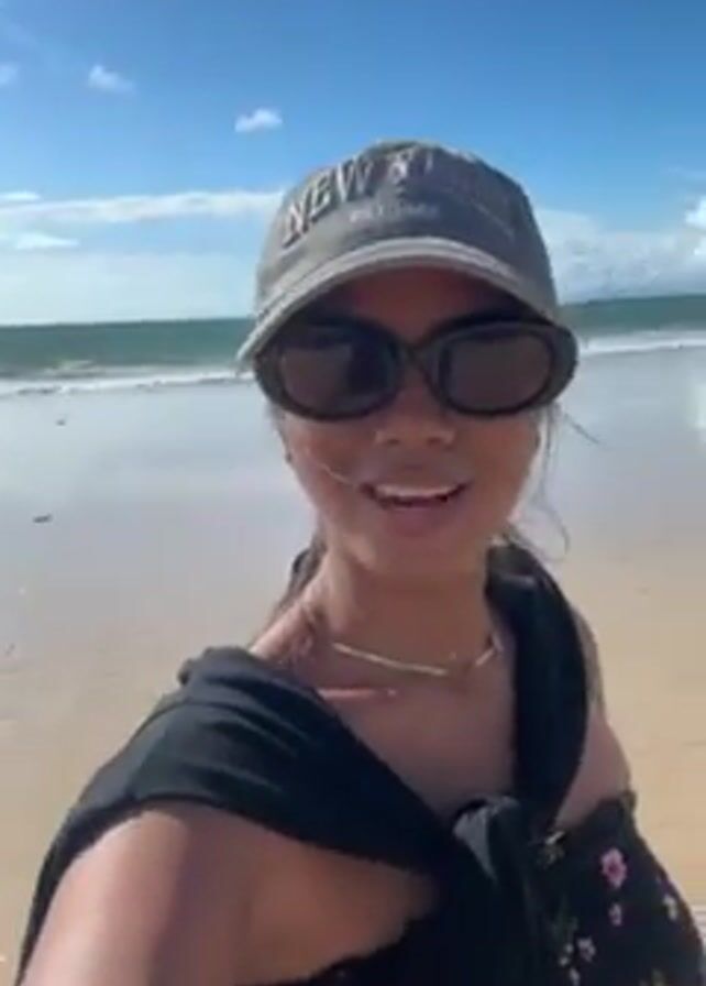 A woman is on a beach. She wears a baseball cap, sunglasses, a black dress with a floral pattern, and a necklace. She is holding the camera at arm's length, recording herself. She is smiling and laughing and sticks her tongue out at the camera. The beach has light sand, and the ocean waves are visible in the background. The sky is blue with some white clouds. The camera is tilted upward, showing more of the sky and trees in the background as the video progresses.