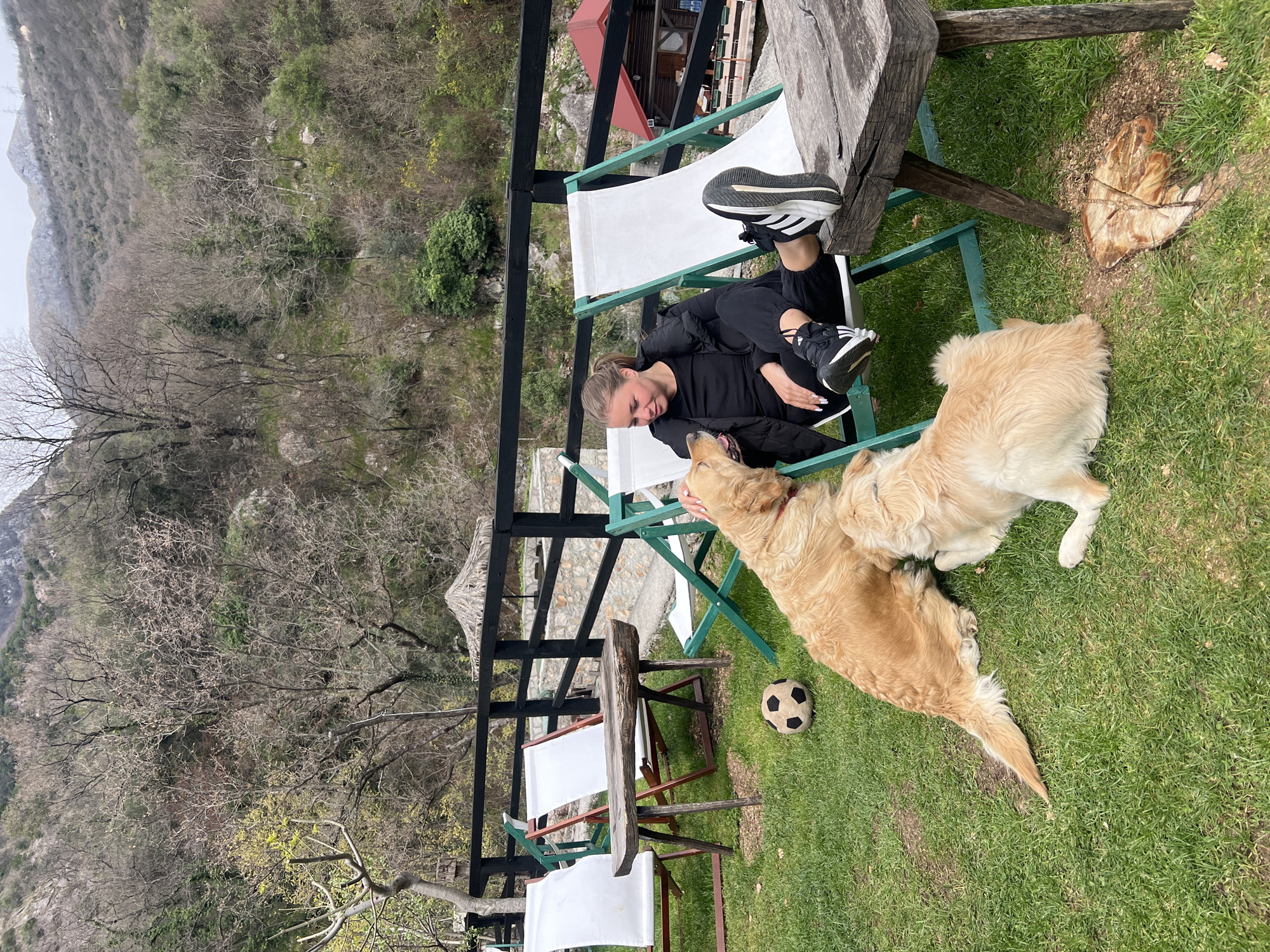 A young woman in a black outfit lies in a white and green deck chair, interacting with two golden retriever dogs. The dogs are near her, one possibly nuzzling her face. The setting appears to be an outdoor area, possibly a patio or garden, with a black-framed structure overhead and other chairs nearby. A soccer ball is visible on the grass. In the background, there are trees and a mountainous landscape. The image does not include enough information to determine if this is Krapina in Montenegro.