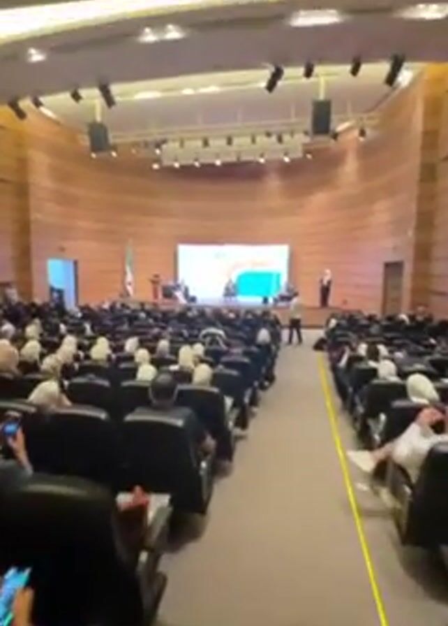 large conference hall filled with seated attendees, most of whom are facing a stage. On the stage, a panel of people is visible. A presenter stands to the side. The hall has a high ceiling with lighting fixtures and wooden paneling on the walls. An aisle runs through the middle of the seating area, marked by a yellow line. An Algerian flag stands near the stage. Some attendees are using their phones. The camera pans slightly, providing a wider view of the room.