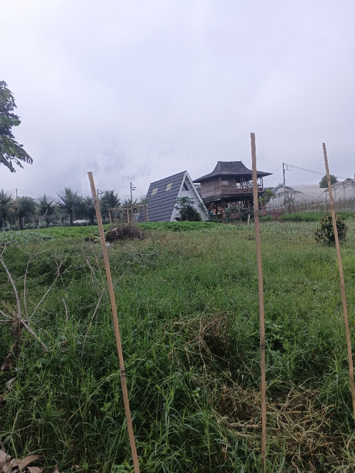A landscape view captures two distinctive houses, an A-frame with a grey roof and a traditional wooden house elevated on stilts, set against a backdrop of lush green fields under a cloudy sky. The foreground is dominated by overgrown grass and vegetation, with three wooden poles positioned vertically, partially obscuring the view. Beyond the houses, a row of trees and a white greenhouse are visible, adding to the rural scene.