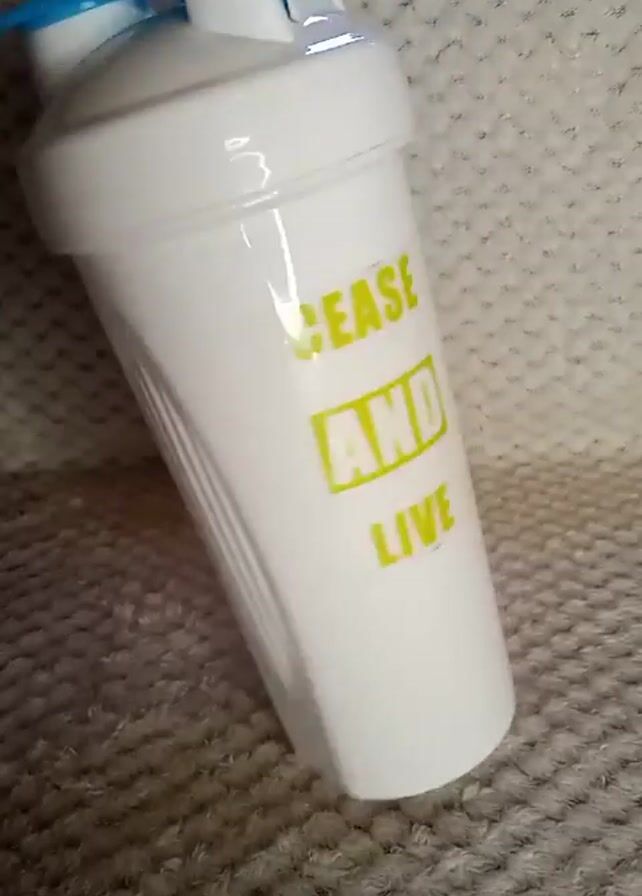 white shaker bottle with a blue handle and cap, sitting on a textured surface. The bottle has a yellow sticker on it that says "CEASE AND LIVE." A hand holds the bottle. The bottle is tilted slightly to the left. The hand rotates the bottle, showing its different sides.