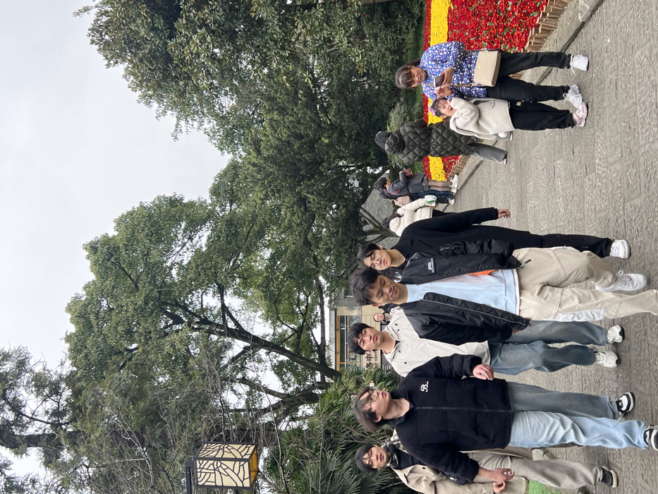 A group of people stands on a paved path next to a flower display and trees. Six individuals in casual wear are lined up facing left, with some wearing jackets. Behind them, a couple, including a child, is near the flower display. Trees with dense foliage dominate the left side of the frame, and the sky appears overcast. A decorative lantern is visible near the trees.