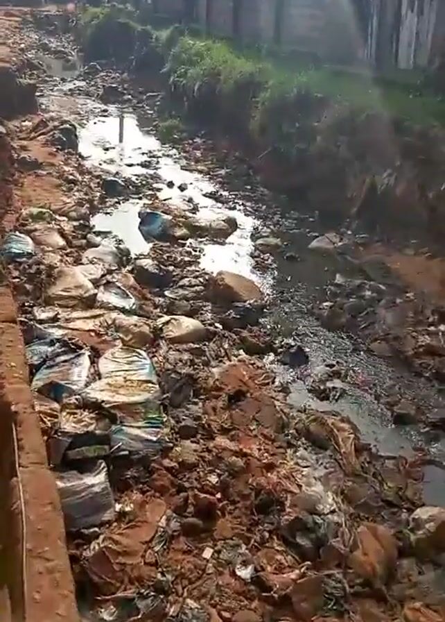 heavily polluted stream or drainage ditch in an urban environment. The waterway is filled with garbage, including bags of trash, plastic debris, and general refuse, which is mixed with mud and rocks. Water flows sluggishly through the trash. The banks of the waterway are made of bare earth and concrete. Buildings are visible in the background, indicating a residential or commercial area. The sky is overcast. The scene is unsanitary and visually polluted, reflecting poor environmental conditions.