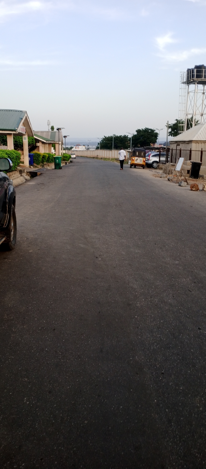 An outdoor scene in Lokoja, Nigeria, depicts a paved asphalt road extending into the background under a pale, overcast sky