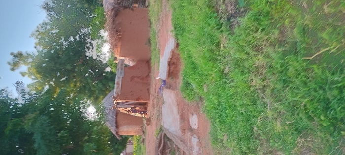A rural scene presents two mud houses with thatched roofs. The structures are earth-toned and sit amidst lush greenery, suggesting a natural environment. The houses appear rustic and traditional. A dirt path winds past the buildings, contrasting with the vibrant green grass. Overhead, a tree canopy filters sunlight. The scene embodies simplicity and a close connection to nature.