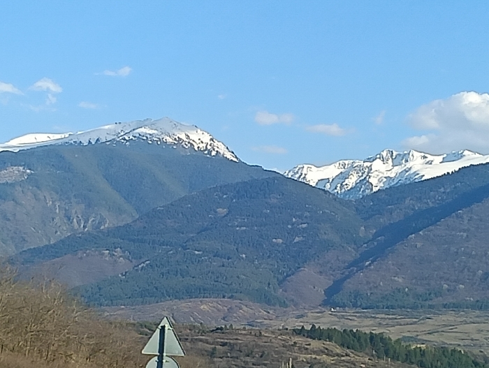The image displays a panoramic mountain landscape under a bright blue sky with sparse white clouds. Multiple mountain ranges are visible. The furthest peaks, predominantly in the center and right half of the image, are rugged and extensively covered in bright white snow. A prominent snow-capped peak is also visible on the far left. Below these snowlines, successive layers of mountains are densely covered in dark green coniferous forests, with some sections revealing bare, brownish-grey rock and earth. A valley floor with sparse vegetation and darker forested patches extends into the middle distance. In the bottom-center foreground, a portion of a triangular road sign, white with a black border, is partially visible, obscuring its full symbol. Bare deciduous trees and shrubs with brown branches occupy the immediate foreground on the left. The scene is illuminated by daylight, casting subtle shadows on the mountain slopes. No individuals or specific actions are depicted. The location is in the vicinity of the city of Dupnitsa, Bulgaria.
