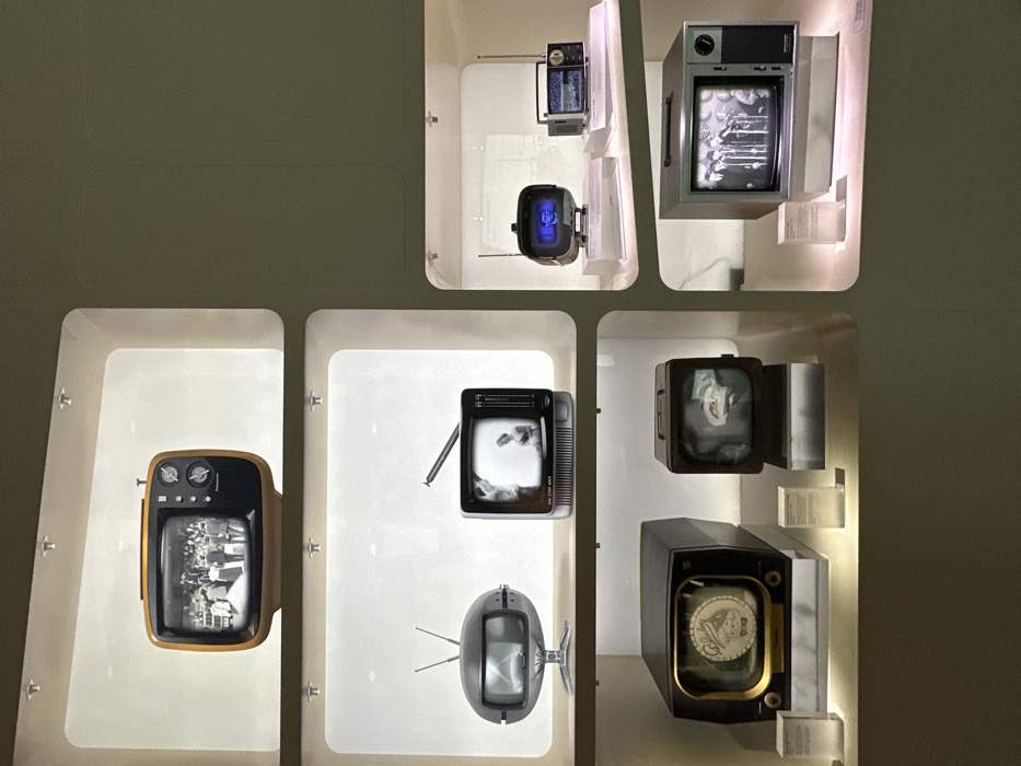 - "This image depicts an exhibit of vintage televisions displayed within illuminated, recessed compartments against an olive-green wall" by FM-e0TMf1, licensed under CC BY 4.0