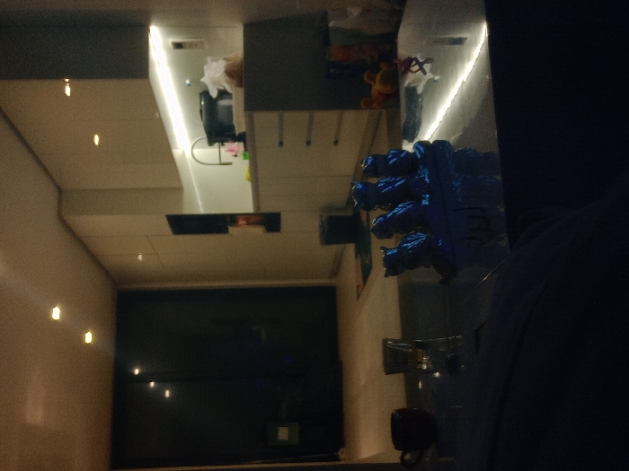 The photo displays an interior scene, viewed from a tilted perspective. A kitchen area is visible with a stovetop, cabinets, and assorted items like a toy. The room transitions into a darker area, possibly another room, marked by a large, dark surface. The lighting is dim, with several small lights illuminating the left wall. The right side of the image is heavily shadowed, obscuring details.