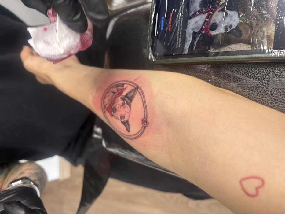 A fresh tattoo of a dog's head inside a circle is on a person's arm. The tattoo is black and white, with a touch of red on the dog's collar and the circle design. The area around the tattoo is red and irritated, suggesting it was recently done. A gloved hand wipes the area with a bloody cloth. A phone displaying a photo of the same dog is above the tattoo. Further down the arm is a small, simple heart tattoo.