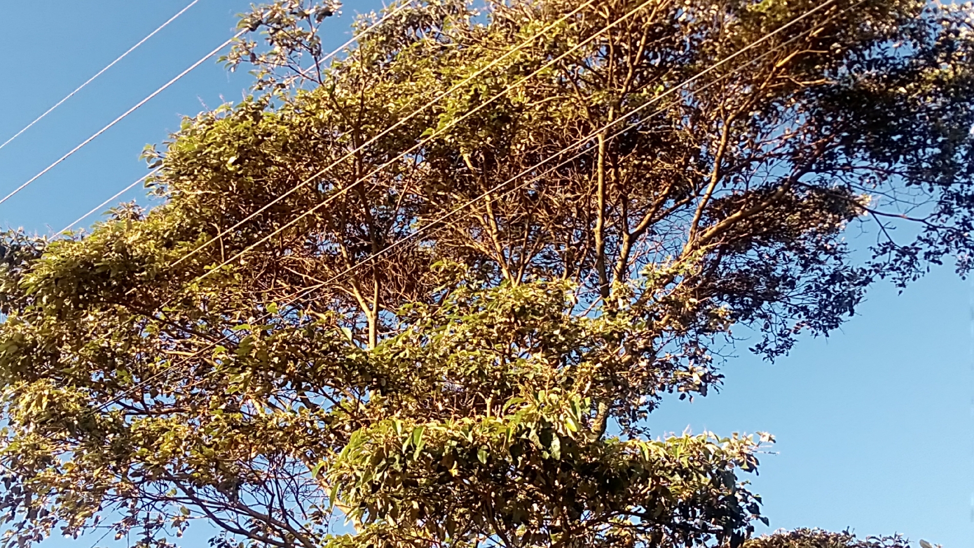 The image captures an outdoor scene in Ndeiya, Kenya, focused upwards on a dense tree canopy against a clear, light blue sky. Multiple thin, white utility lines traverse diagonally across the frame from the upper-left to the lower-right, passing through and above the tree's foliage. The tree exhibits a mixture of vibrant green leaves, some appearing sunlit with brighter highlights, and areas of darker green foliage, alongside visible brown branches. No people or animals are present in the frame.