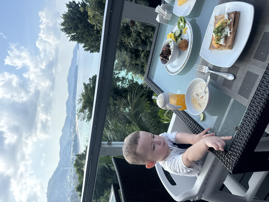 A baby sits in a high chair at a table laden with breakfast items: toast, a bowl of soup, and a plate with vegetables and meat. An orange-filled baby bottle sits next to the soup. The table has a glass top with a woven edge. Beyond the table, a scenic vista includes trees, a body of water, and a cloudy sky. A metal railing runs along the left edge of the image, adding a touch of structural detail.