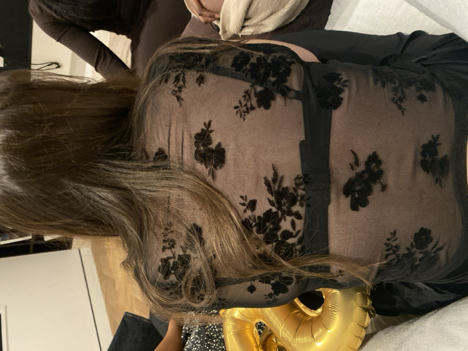 A woman with long brown hair wears a sheer black floral top over a black bra. The top features a pattern of black floral designs. Part of a gold, balloon number '8' is visible near her shoulder. Another person in brown clothing sits to the side. The background includes a wooden floor and a cream-colored surface.