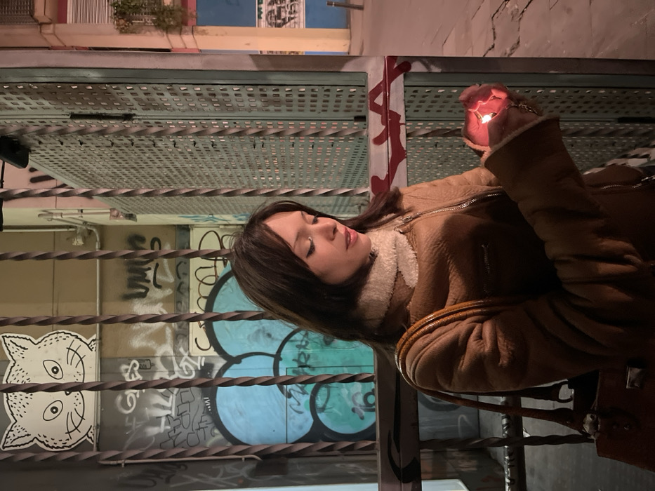 A woman in a brown, shearling-lined jacket gazes at a luminous object in her hand, likely a phone or electronic device. She stands behind a wrought-iron fence with graffiti-covered walls in the background. The setting appears to be an urban alleyway or street at night, possibly near a closed shop or building with security gates. Red paint or graffiti is seen on a pillar next to her.