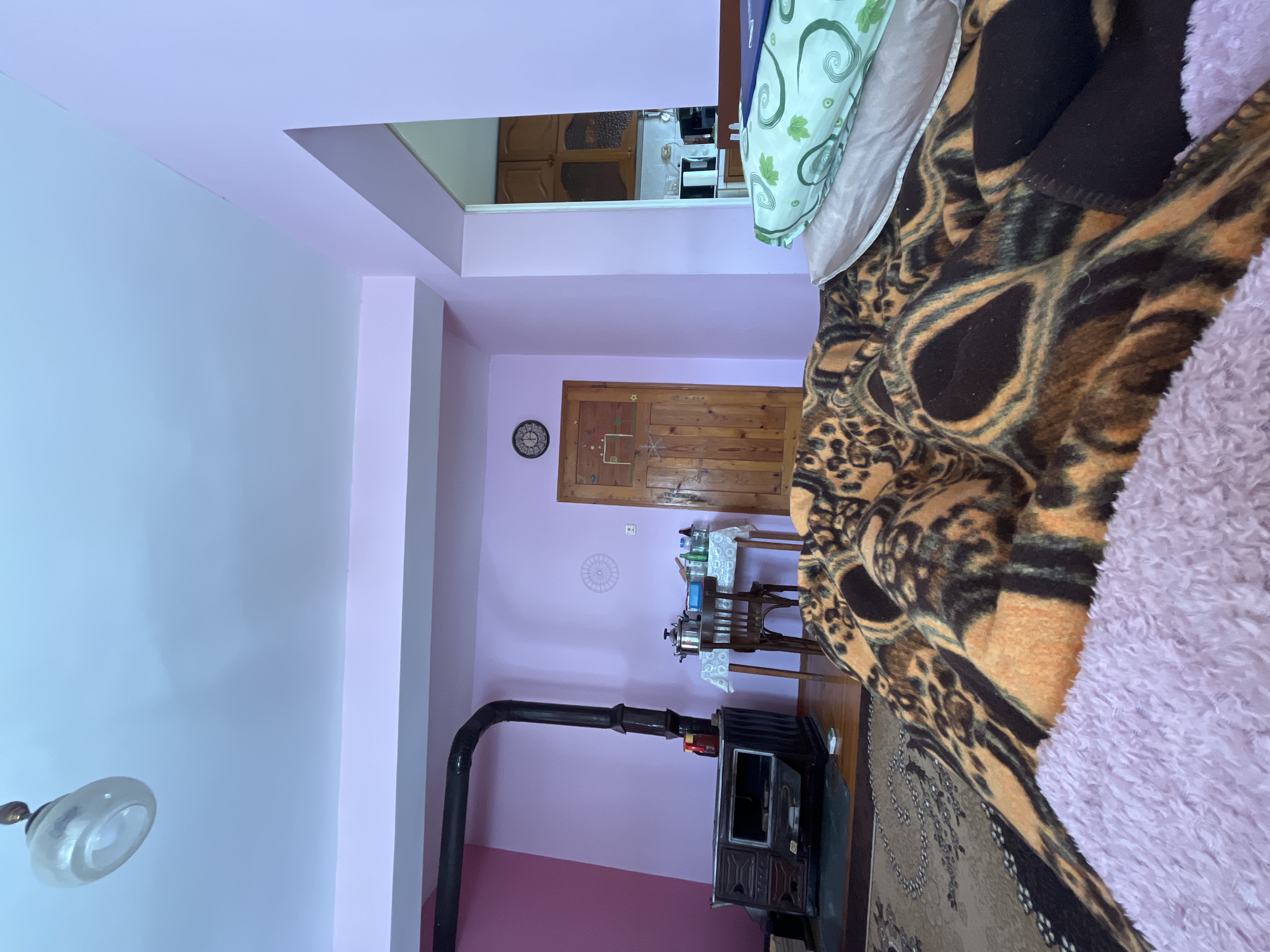 The image depicts an indoor scene within a residence in Balgarin, Bulgaria, viewed from a low perspective, likely from a bed or similar resting place. In the immediate foreground, a light pink fluffy blanket partially covers a brown and orange animal-print blanket. To the right, a stack of pillows includes a light gray one and a green one with a white leaf and swirl pattern. The room's walls are predominantly painted a light lilac color, with a section on the far left exhibiting a darker magenta hue. On the left, a black, ornate wood-burning stove is situated on a dark mat, with its black flue pipe extending upwards and curving to the left, terminating near the ceiling. To the right of the stove, a small rectangular table with a white lace-patterned tablecloth holds various kitchen items, including several pots with lids, bottles, and a glass. A dark wooden chair with a slatted back is positioned under this table. Above the table, a circular white decorative item is affixed to the wall. Further into the background, a light wooden door with decorative elements resembling a Christmas tree and snowflakes is visible. Above this door, a circular wall clock with Roman numerals displays the time. To the right of the door, an open archway leads into an adjacent room, revealing light brown wooden kitchen cabinets, a white appliance (possibly a microwave), and white wall tiles. The ceiling is a light blue-white color, from which a single glass light fixture hangs in the upper left corner. No individuals are visible within the frame.