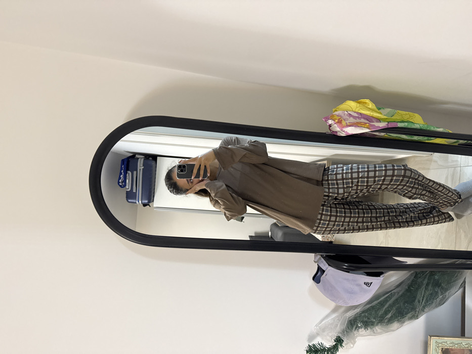 The scene depicts an interior room in Budva, Montenegro. A person is observed in a mirror selfie, reflected in a full-length, black-framed mirror. The individual wears a brown long-sleeved top, plaid pajama pants, and light grey socks. They hold a dark-colored smartphone to cover the lower part of their face, with their right hand additionally covering the left side of their face. In the mirror's reflection, a dark blue hard-shell suitcase, topped with a smaller blue item, rests on a white cabinet or shelf. A white door frame is visible to the right of the suitcase. To the left of the mirror, a light purple baseball cap with a white logo is present, along with a plastic-wrapped green artificial Christmas tree and a partially visible gold-framed picture. A colorful patterned fabric item leans against the wall to the right of the mirror. The room features plain white walls and a light-colored floor.