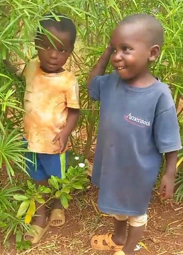 Two young children stand side-by-side next to a green leafy plant. The child on the left wears an orange and yellow tie-dye t-shirt and blue shorts. The child on the right wears a dark blue t-shirt with the word "Ameritech" on it. Both children wear yellow sandals. The child on the right is smiling and has one hand on his head. The ground is dirt and scattered dry leaves.