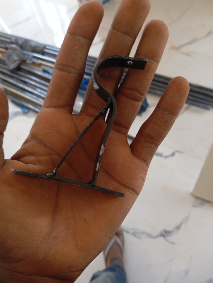 The scene is located in the city of DU, Nigeria. A dark-skinned left hand, palm facing upwards, dominates the foreground, holding a small, dark, S-shaped metal object. The object, approximately 10-12 cm in height, features a flat horizontal base, two slender vertical supports, and a distinct S-curve at its apex. Visible surface imperfections and light-colored scuffs are present on the metal, along with a small circular perforation near the top end. The individual holding the object wears blue denim trousers and a white flip-flop on their right foot, partially visible in the lower right background. The environment consists of an indoor space with a light-colored, possibly white or off-white, tiled floor exhibiting dark, irregular vein patterns. In the blurred background to the left, a bundle or stack of long, thin metallic rods or pipes, some with partial blue wrapping, is discernible. A plain light-colored vertical surface is partially visible on the far right. The scene is brightly illuminated.